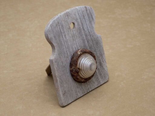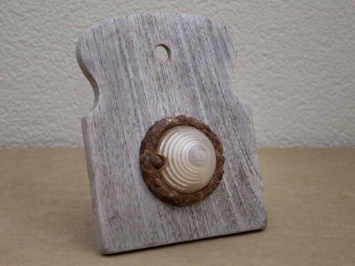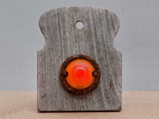 ‘Broodwinning’. Klein lichtkunstobject met gebruikmaking van gevonden voorwerpen op de oevers van de Maas; een houten broodsnijplankje en een vintage auto- of bromfietslichtje. In zwakke lichtomstandigheden gaat het lichtje automatisch aan en verandert doorlopend van kleur. Met vaste USB-kabel voor de stroomvoorziening. Te koop.